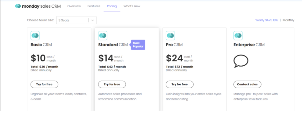 Monday CRM provides four price options based on the size and needs of your moving business.